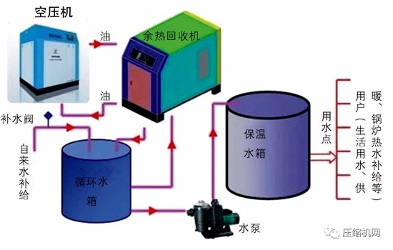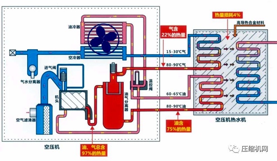 壓縮機(jī)熱能熱水機(jī)組是將高溫循環(huán)油(和高溫壓縮氣體)引入熱能熱水機(jī)組內(nèi),空壓機(jī)運(yùn)行過(guò)程中所產(chǎn)生的熱能被熱能熱水機(jī)充分吸收,同時(shí)壓縮機(jī)得以降溫。