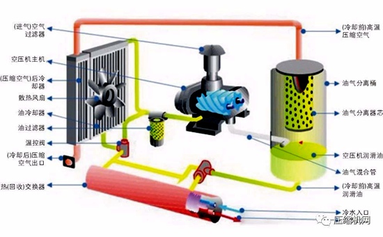 機(jī)械螺桿的高速旋轉(zhuǎn),同時(shí)也摩擦發(fā)熱,這些產(chǎn)生的高熱由空壓機(jī)潤(rùn)滑油的加入混合成油/氣蒸汽排出機(jī)體,這部分高溫油/氣流的熱量相當(dāng)于空壓機(jī)輸入功率的1/4。它的溫度通常在80℃(冬季)-100℃,(夏秋季)這些熱能都由于機(jī)器運(yùn)行溫度的要求,都被無(wú)端地廢棄排往大氣中,即空壓機(jī)的散熱系統(tǒng)來(lái)完成機(jī)器運(yùn)行的溫度要求。
